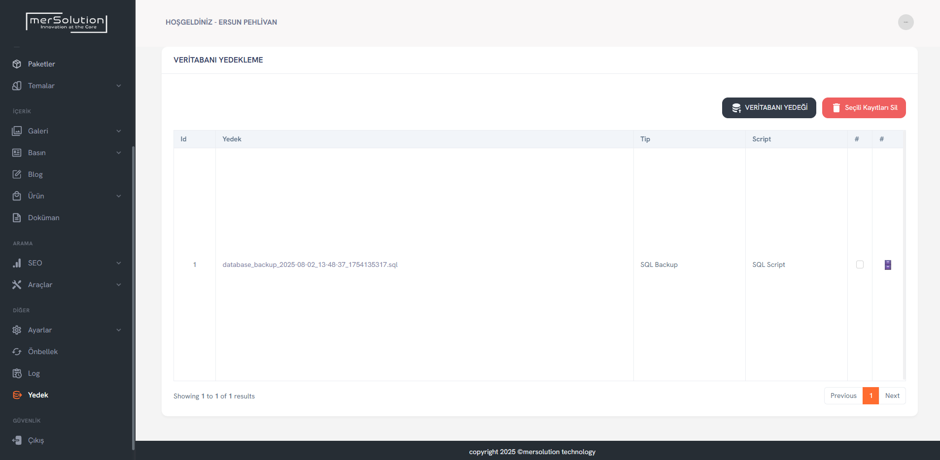 Panel üzerinden veritabanı yedeği alma, önbellek temizleme ve sistem log takibini kolayca yapabilirsiniz.