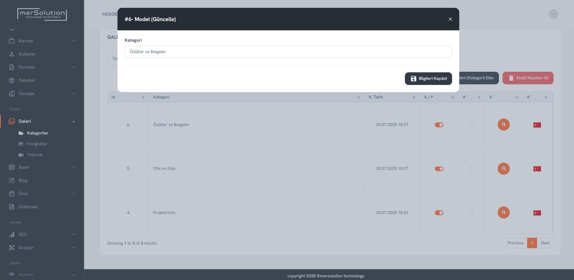 Görselliği ön plana çıkaran slider yönetimi, kategori bazlı resim/video galerisi ve medya içerik modülü sunar.