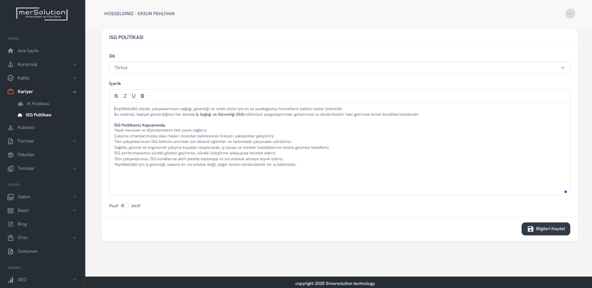 Kalite belgeleri, yönetim politikaları ve dokümantasyonlar PDF ya da görsel olarak sisteme yüklenebilir.