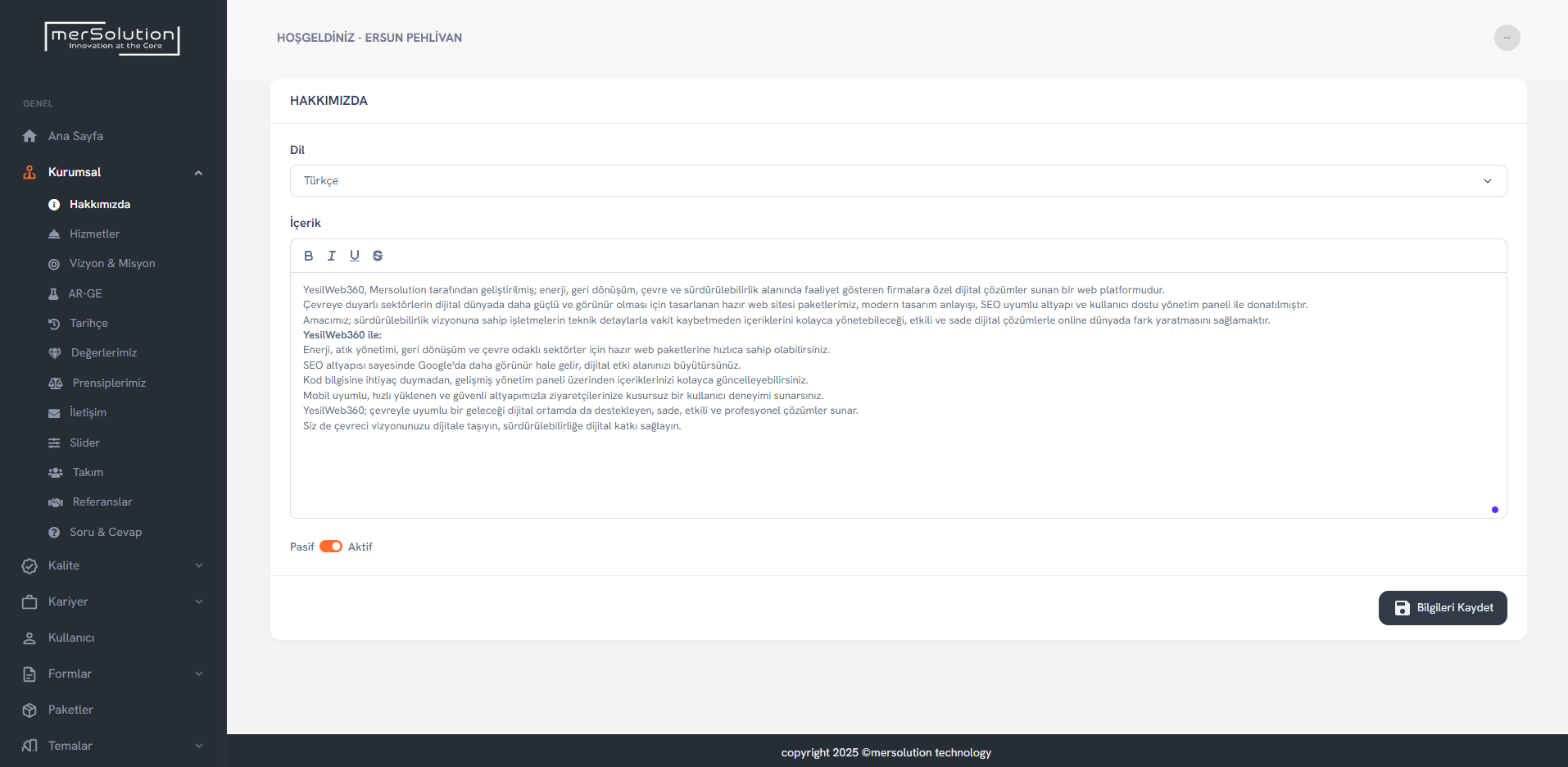Sayfa, hizmet, proje gibi bölümlerde özel başlık, açıklama ve anahtar kelime tanımlama desteği mevcuttur.