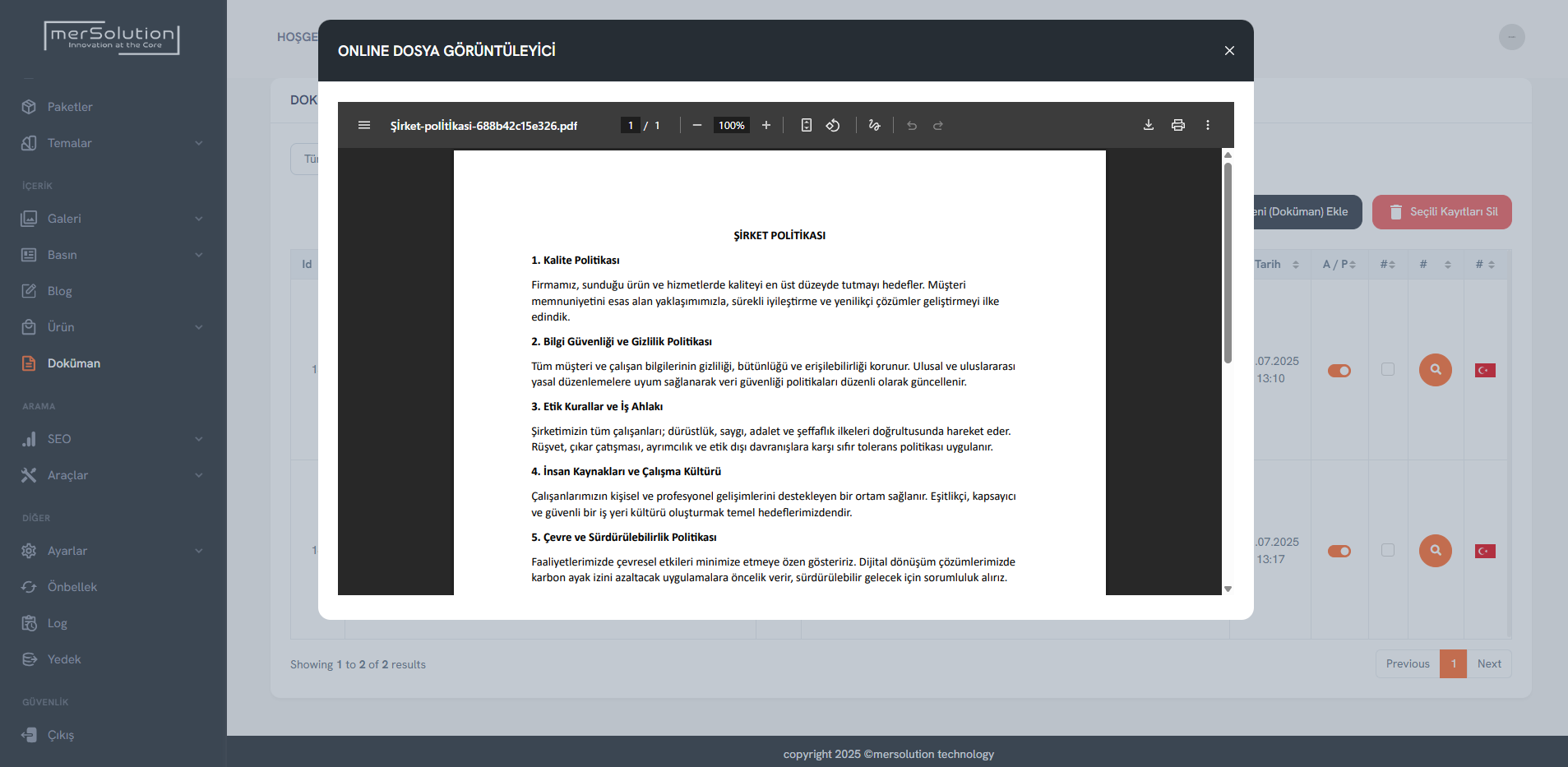 Kalite belgeleri, yönetim politikaları ve dokümantasyonlar PDF ya da görsel olarak sisteme yüklenebilir.