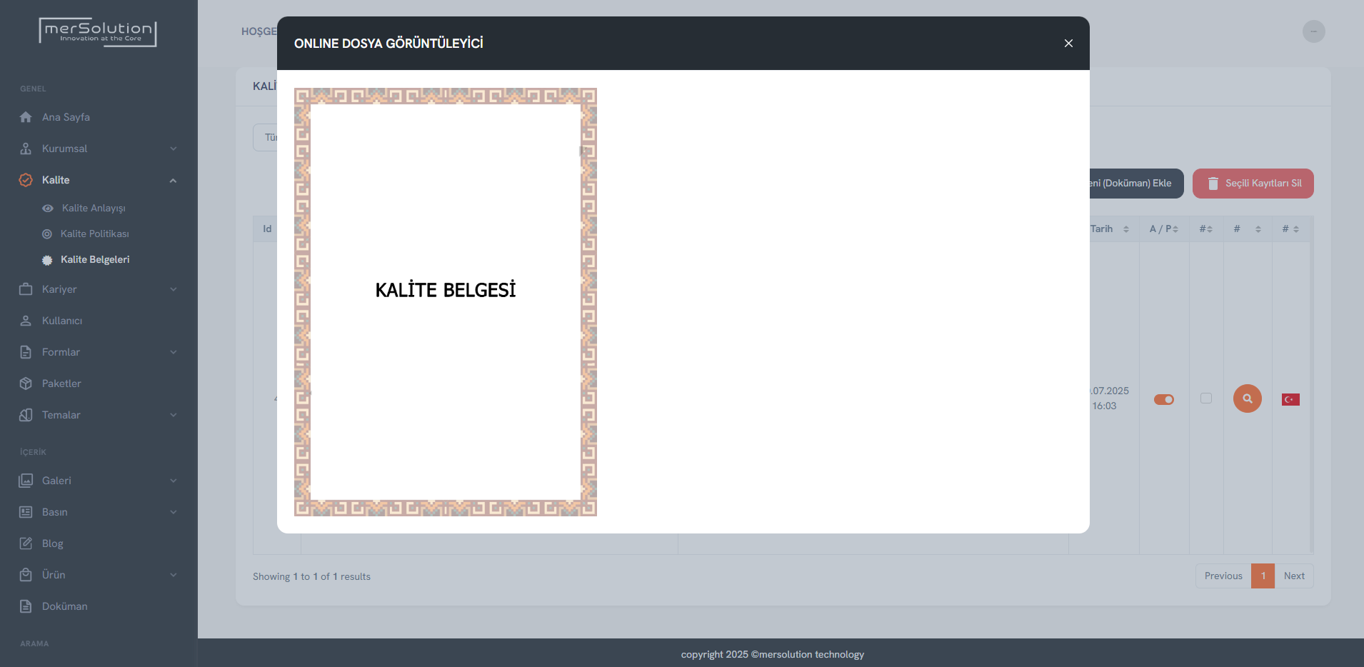 Kalite belgeleri, yönetim politikaları ve dokümantasyonlar PDF ya da görsel olarak sisteme yüklenebilir.
