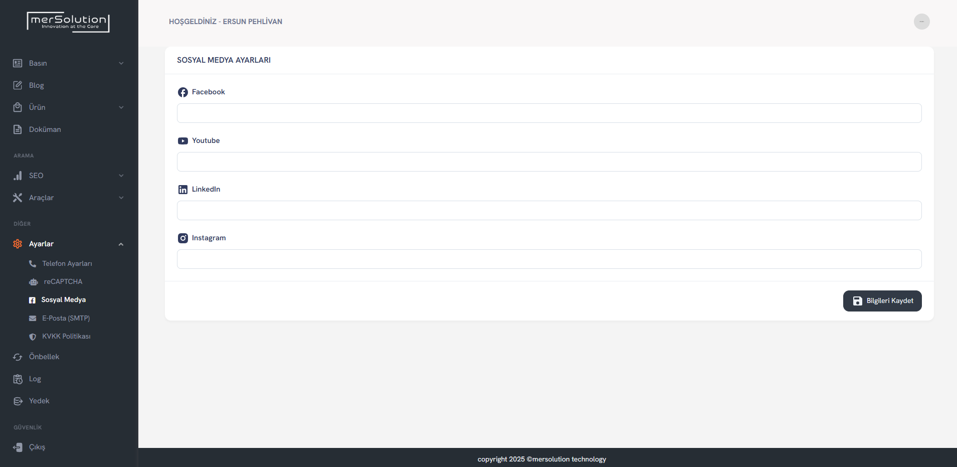 Panelden sosyal medya linkleri ve Google Haritalar bağlantıları kolayca düzenlenebilir.